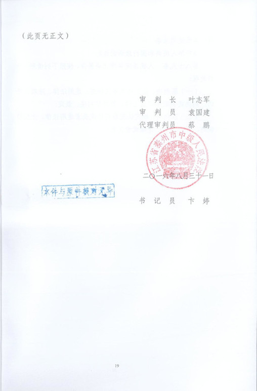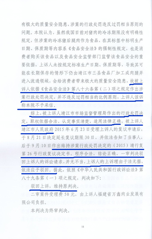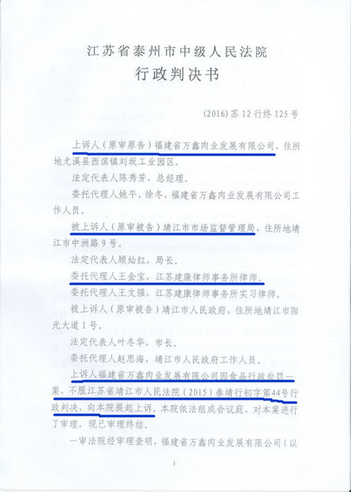 2016年12月22日,本所主任王金宝律师终于收到了泰州市中级人民法院寄送的(2016)苏12行终125号二审行政判决书。二审法院维持了靖江市人民法院的一审判决。至此,这一在江苏食品药品监管系统引起巨大反响和争议的85万元食品安全行政处罚案终于落幕,被诉行政机关靖江市市场监督管理局完美胜诉!